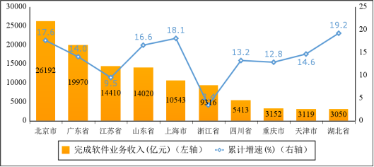 東部、東北地區保持較快增長,中部地區增勢突出。2023年,東部、中部、西部和東北地區分別完成軟件業務收入100783億元、6965億元、12626億元和2884億元,分別同比增長13.8%、17.4%、8.7%和13.9%。其中,東部、中部、東北部地區高出全國平均水平0.4、4.0、0.5個百分點。四個地區軟件業務收入在全國總收入中的占比分別為81.8%、5.7%、10.2%和2.3%。
