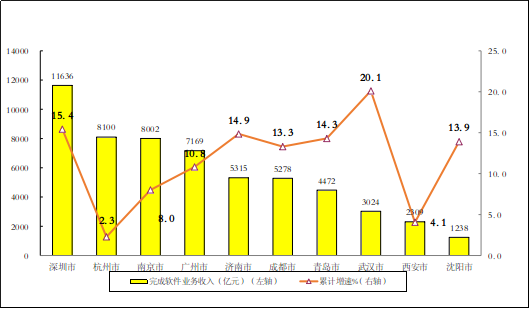中心城市軟件業務收入穩步增長,利潤總額增速大幅提高。2023年,全國15個副省級中心城市實現軟件業務收入59604億元,同比增長11.2%,增速較上年同期提高1.2個百分點,占全國軟件業的比重為48.4%;實現利潤總額7936億元,同比增長15.6%,增速較上年同期提高13.2個百分點。其中,哈爾濱、武漢、大連、深圳、濟南、青島、廈門和沈陽軟件業務收入同比增速超過全行業整體水平。