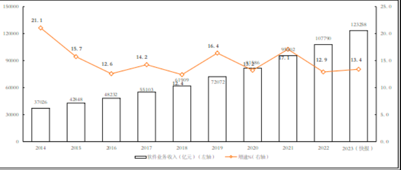 2023年全國軟件業務收入123258億元,同比增長13.4%