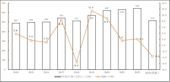 軟件業務出口小幅下滑。2023年,軟件業務出口514.2億美元,同比下降3.6%。其中,軟件外包服務出口同比增長5.4%。