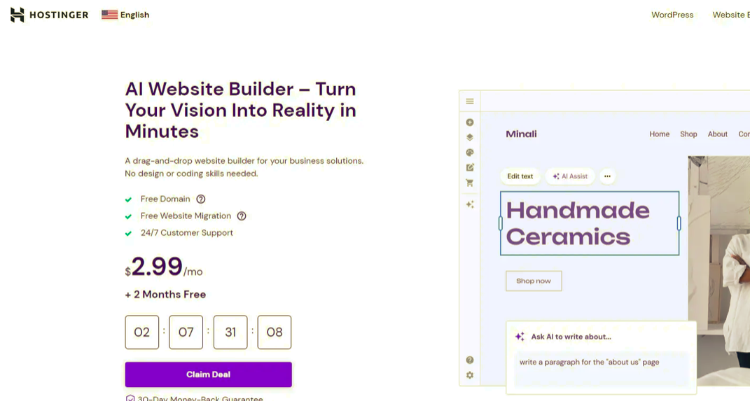 三、Hostinger:適合初學(xué)者的最佳人工智能網(wǎng)站構(gòu)建器