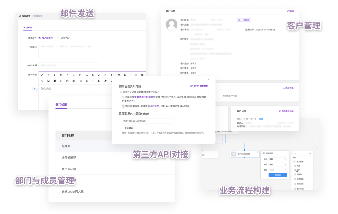 而對(duì)內(nèi)管理部分,與企業(yè)微信內(nèi)建了一些常用的比如OA功能類似,數(shù)字化官網(wǎng)也內(nèi)建了內(nèi)部業(yè)務(wù)使用的客戶管理、組織管理、企業(yè)資料管理等能力。