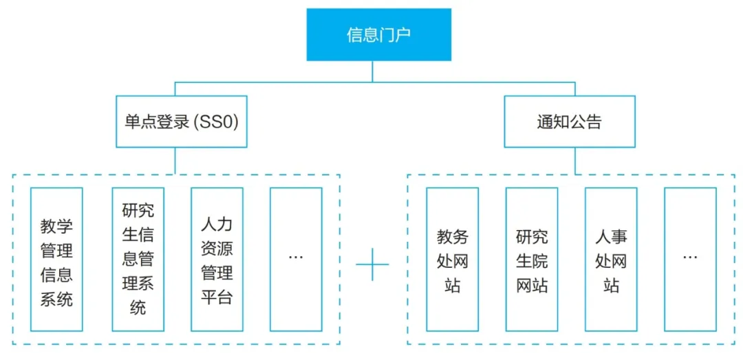 應(yīng)用支撐。應(yīng)用是融合門戶實現(xiàn)融合的信息和系統(tǒng)來源,包括人、財、物、辦公以及學(xué)習(xí)相關(guān),例如辦事大廳、教學(xué)管理信息系統(tǒng)、研究生信息管理系統(tǒng)、人力資源管理平臺、辦公自動化系統(tǒng)、學(xué)院/部處網(wǎng)站、信息填報系統(tǒng)等。