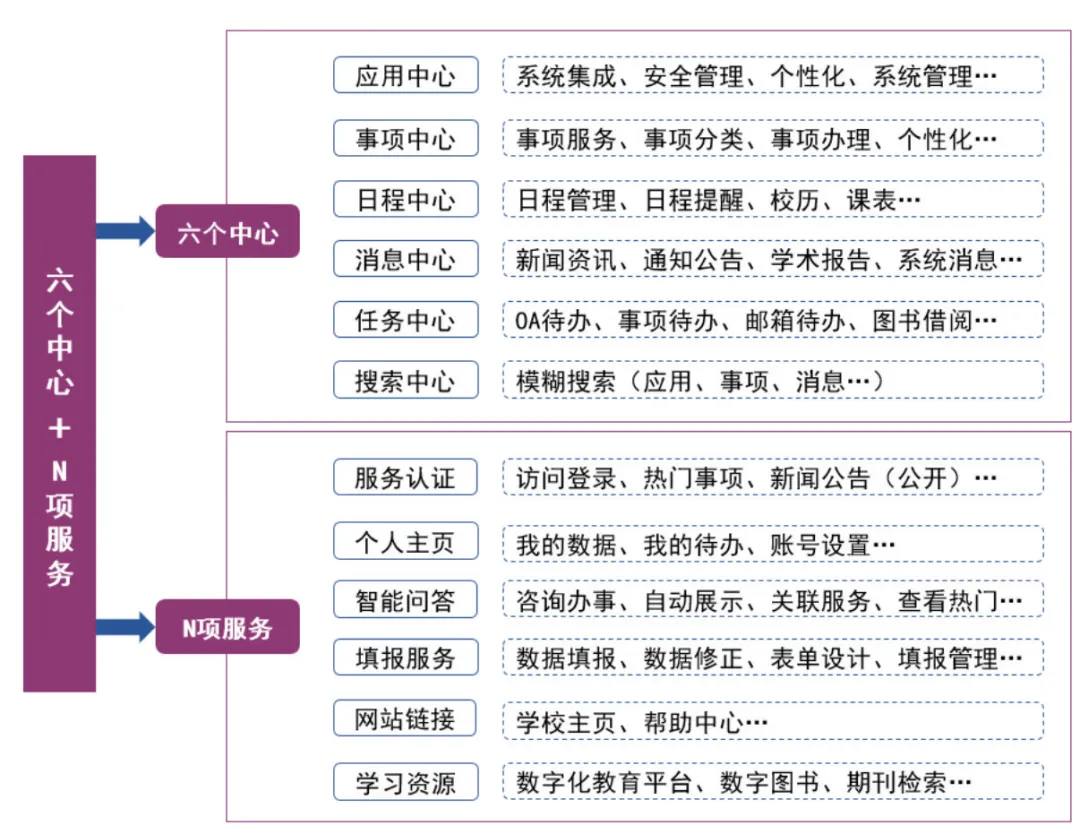 “N項服務(wù)”包括但不限于服務(wù)認(rèn)證、個人主頁、智能問答、填報服務(wù)、網(wǎng)站鏈接、學(xué)習(xí)資源等,支持可擴展信息融合。